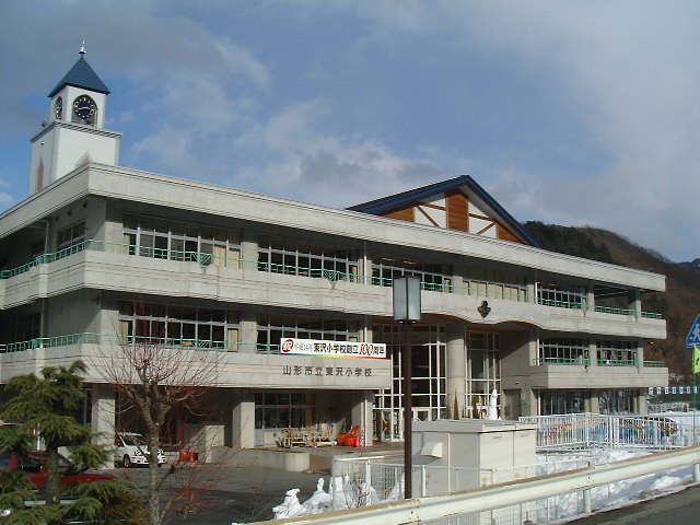 上部の円は太陽であり、東方を示すと共に希望を象徴している。東沢小学校の頭文字「東小」を中心にうきだし、左右に蔵王の名花こまくさを弁化し知性と純真を表し、下方はY字形の渓谷を図形化し気品を示し、郷土の特色を表現している。